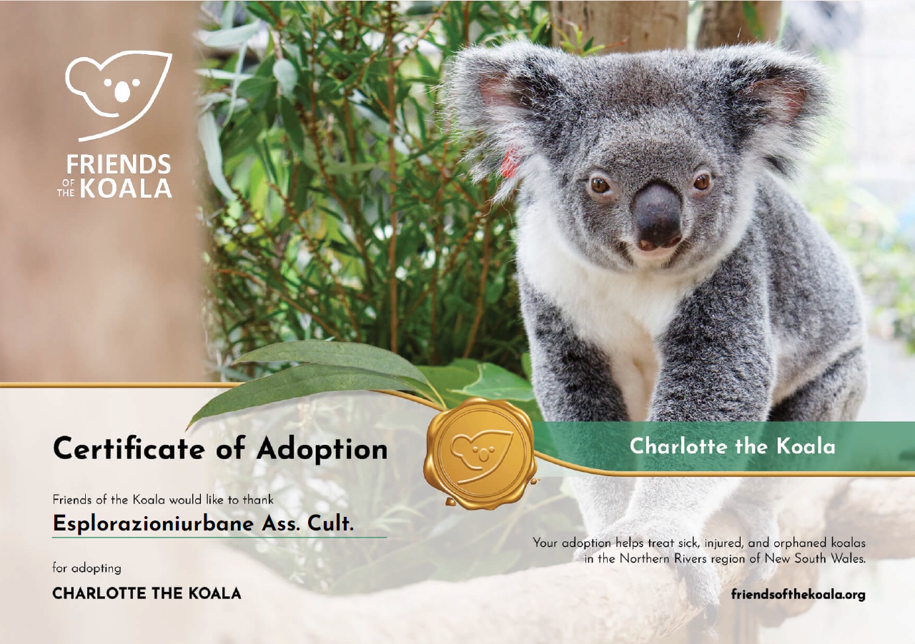 dopo la prematura morte del nostro piccolo guerriero, TRIUMPH, il primo koala che abbiamo adottato . abbiamo continuato a farlo. prendemmo in adozione CHARLOTTE. una giovane Koala che è resident presso la Associazione Friend of the Koala, con cui siamo in stretto contatto. asociazione che in australia, sta salvando decine di Koala, dall'abbandono, dalle cause naturali e dalla sua estinzione.